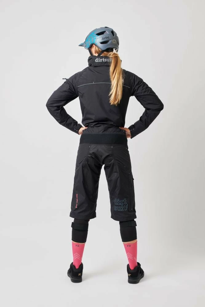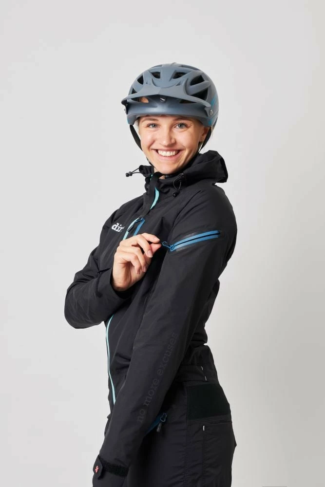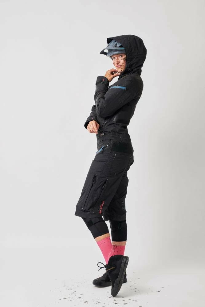 Draußen kann es stürmen, regnen oder schneien… mit dem dirtsuit pro edition bleiben aktive Bikerinnen von Kopf bis Fuß trocken und sauber.